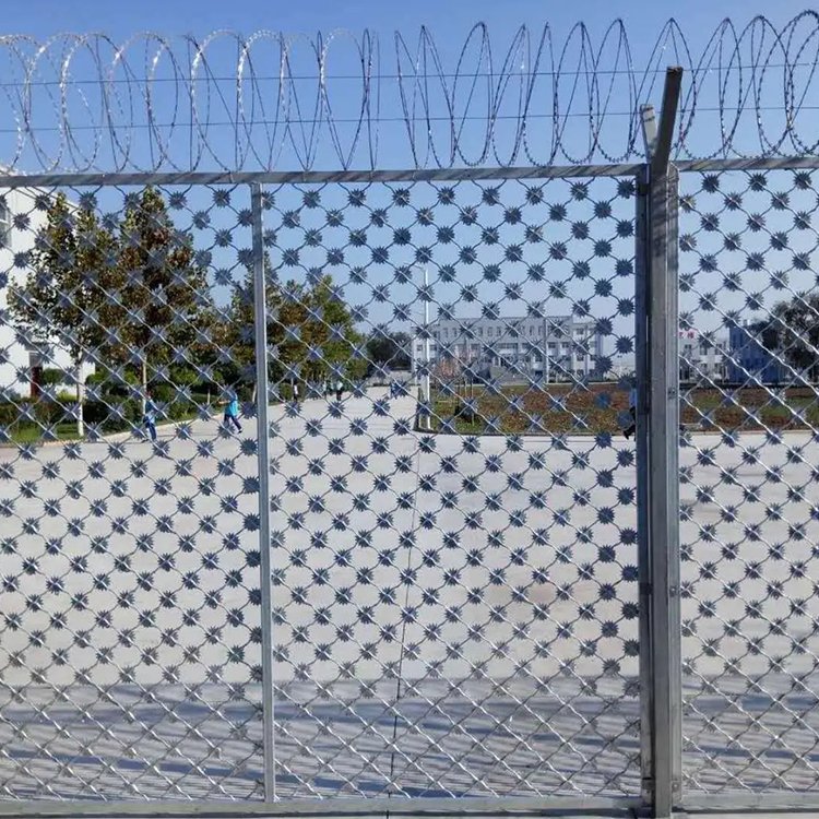 最后巡邏道刀刺網頂部的蛇腹形防攀爬網。刀刺防攀爬網的直徑一般是50公分和60公分。看守所武警巡邏道刀刺網是高墻上面安裝防止犯人逃跑設計必須要高架上面安裝蛇腹形防攀爬網,可以防止攀爬不容易翻越從而起到很好的防護作用。