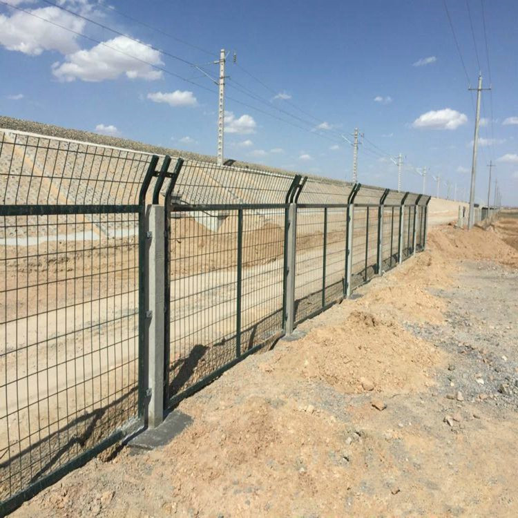鐵路防護柵欄又稱鐵路隔離柵是用于鐵路兩側的隔離防護設施起隔離和防護作用的護欄網產品,應用于高速公路、鐵路、高鐵、大型場地安全防護用。采用高強度低碳鋼絲、鋁鎂合金絲,或鍍鋅絲編織焊接而成,具有組裝靈活、結實耐用的特點,既可以制作成護欄網墻使用,也可以用做臨時隔離網,在使用中只需采用不同的立柱固定方式便可安裝(立柱還包括水泥柱子),產品防腐 防曬 防水表面處理有、電鍍、熱鍍、噴塑、浸塑的方式。鐵路護欄在國內許多高鐵、高速公路 等道路兩側大量使用。產品表面顏色為墨綠色和草綠色,鍍層厚度為0.5~0.6mm,鍍粉采用抗老化性能的進口耐候性樹脂粉料,表面光滑。鐵路防護柵欄邊框有角鐵或者鋼管兩種焊接方式。