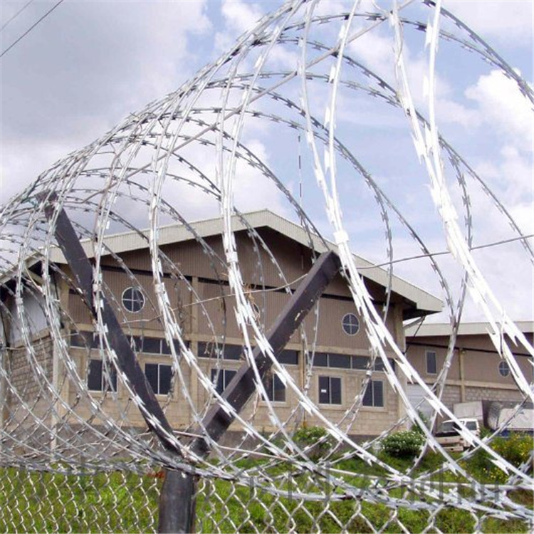 它是用不同材質的鋼板與不同材質的絲兩種原材料組合而成,先把所需材質的鋼板沖壓出刀片的尖刀直條,在和所需材質的絲包裹在一起,在制作出我們所需要的圈直徑即可,刀異常的鋒利,只要觸摸到就會被刺傷,不可能讓非法分子有攀爬翻越的機會,是現代社會各場所圍墻安裝的最佳防護隔離網。