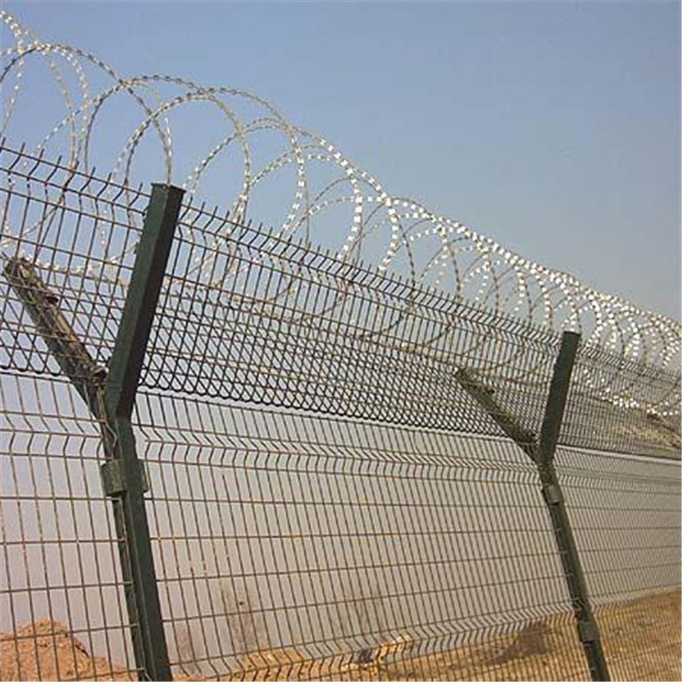監(jiān)獄金屬隔離網(wǎng)墻又稱作“Y型安全防御護(hù)網(wǎng)”,是由V型支架立柱,加強(qiáng)型焊接片網(wǎng),安全防盜連接件和熱鍍鋅刀片刺籠組成強(qiáng)度和安全防御性級別很高。近年來,被廣泛應(yīng)用在監(jiān)獄,軍事基地等高安全場所。在監(jiān)獄金屬隔離網(wǎng)墻頂部加裝刀片剌絲、刀片剌繩后又很好的增強(qiáng)了安全防護(hù)性能。