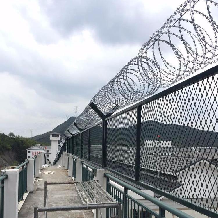 監獄隔離網頂部常加裝不銹鋼螺旋式刀刺網,刀片刺絲,刀片刺網又名刮刀型刺絲,,是一種防護、隔離能力較強的新型隔離網產品。同時該產品具有美觀、防阻效果好、施工便利等優點。監獄通過對罪犯執行刑罰, ,使他們與社會隔離,失去再犯罪的條件,以防止服刑期間重新違法犯罪。