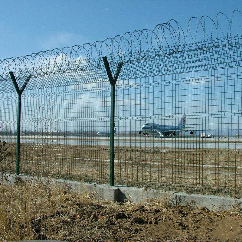 飛機場護欄網又叫機場圍界護欄網、機場隔離網、機場隔離柵等,是作為飛機場邊界保護的重要設施,防止對機場設施的破壞,保證機場安全,讓飛行更加順利。飛機場護欄網又稱作“Y型安全防御護網”,由V型支架立柱,加強型焊接片網,安全防盜連接件和熱鍍鋅刀片刺籠組成強度和安全防御性級別很高。該形式的護欄網近年來,被廣泛應用在機場,軍事基地等高安全場所。在護欄網頂部加裝刀片刺絲、刀片刺繩后又很好地增強了防護性能。