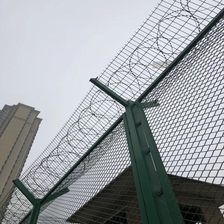 看守所隔離網又稱監獄護欄網或刀片刺網,主要是采用高強度的刀片刺網與普通防護網的結合,由V型支架立柱,加強型焊接片網,安全防盜連接件和刀片剌網組成。刀片刺網是一種新型防護網,由銳利尖角鍍鋅鋼板或不銹鋼薄板做刀片,鋼絲做芯線組合而成的防護器材。
